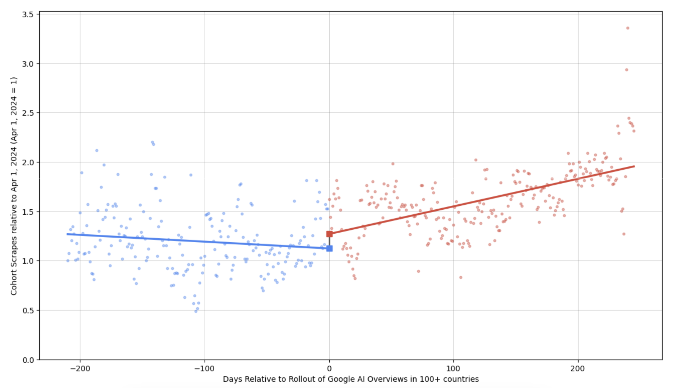 Figure 2.6. Googlebot requests and the global rollout of AI Overviews (0 = 10/28/2024)
